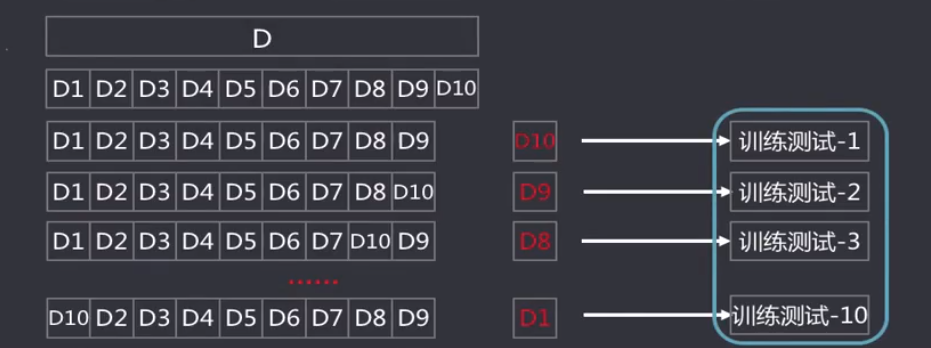 交叉验证法(Cross Validation):将数据集划分k个大小相似的互斥的数据子集,子集数据尽可能保证数据分布的一致性(分层采样),每次从中选取一个数据集作为测试集,其余用作训练集,可以进行k次训练和测试,得到评估均值。该验证方法也称作k折交叉验证(k-fold Cross Validation)。使用不同划分,重复p次,称为p次k折交叉验证。