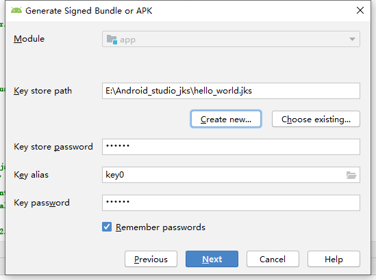 - 在生成签名apk窗口中,选择秘钥库、秘钥,并输入两个密码(如果是新创秘钥,这些字段会自动填充)然后单击Next:
