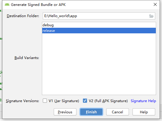 - 选择签署的apk目标目录和签名版本,单击Finish: